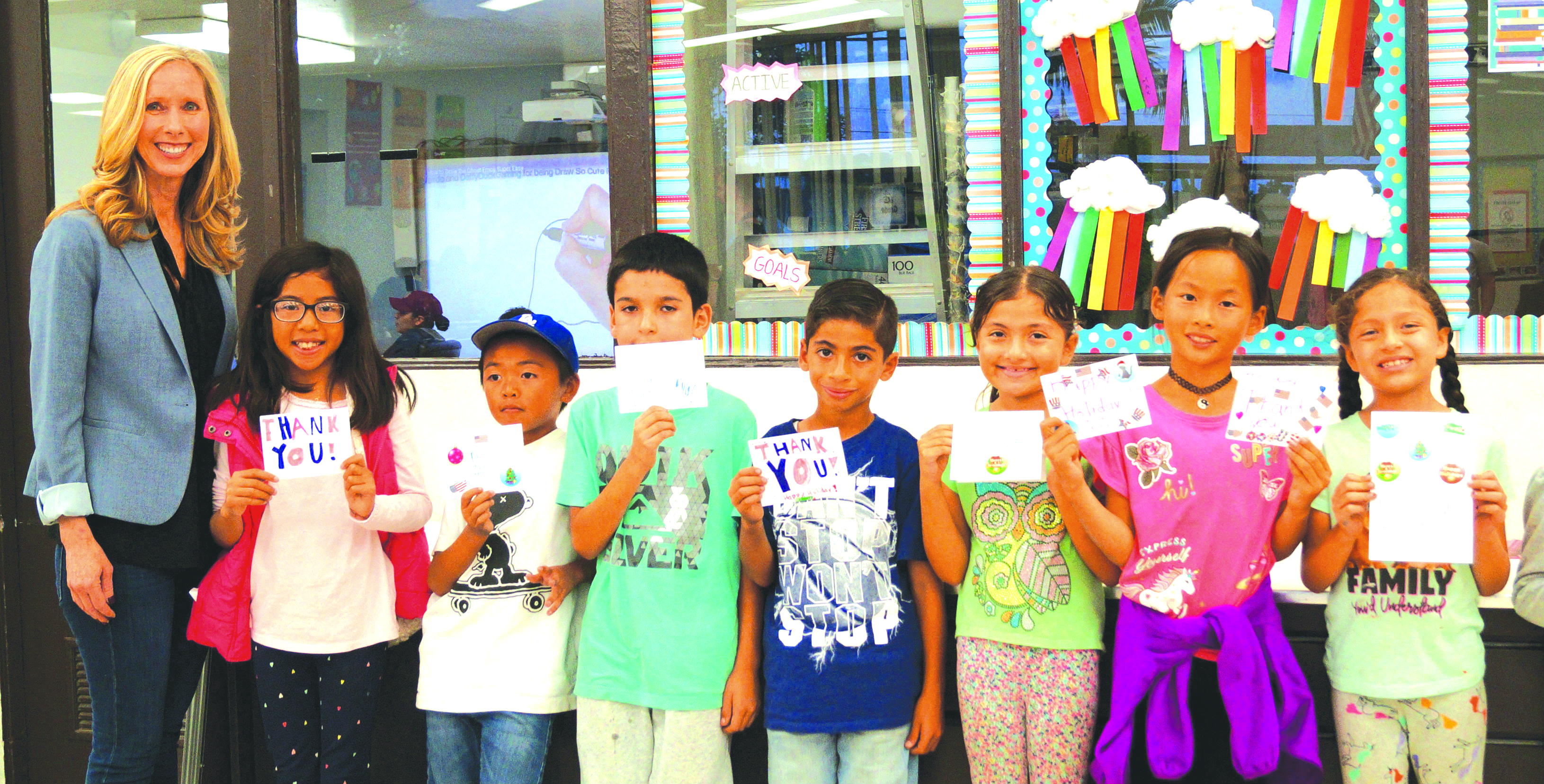 Boys & Girls Club of Cypress members Mara G., Langston S., Roman M., Joseph S., Mariyah H., Kathy S., Brooklynn H., and Suri A. pose proudly with their homemade cards for local veterans alongside Cypress Mayor Pro Tem Stacy Berry.