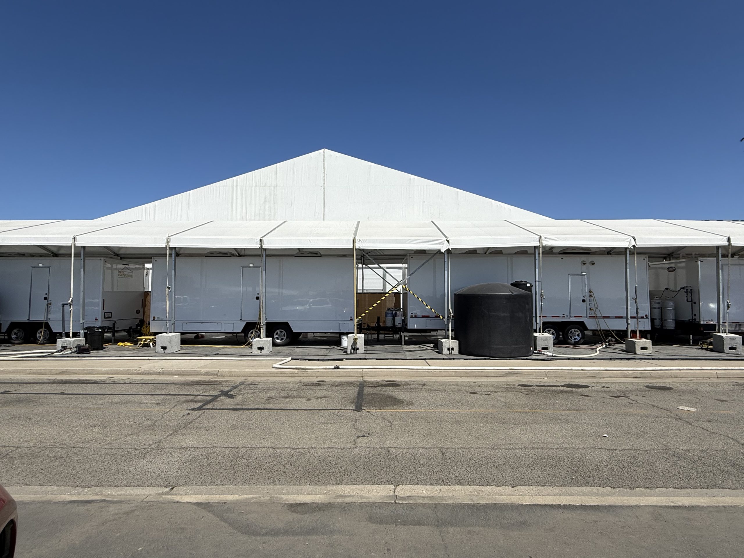 After troops arrived in Los Angeles, a massive tent city was erected at the Joint Forces Training Base in Los Al, while others remained at the Westwood federal building, which was outfitted with sleeping and eating areas.