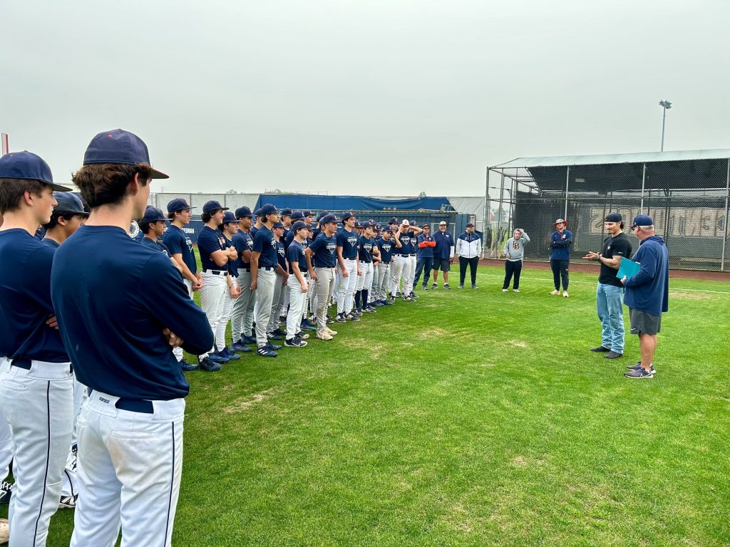 Jarren Duran speaking to the varsity baseball team at Cypress High School, courtesy photo.