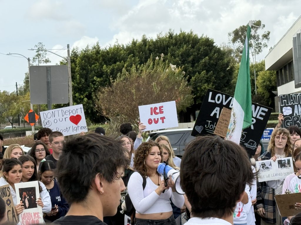 With drums beating, students chanted “ICE OUT” as the throng walked several blocks down Los Alamitos Boulevard. The march proceeded to Katella Ave. and eventually arrived at the parking lot of Los Alamitos City Hall.
